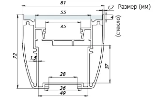 Алюмин.анод. профиль 100Вт/м для прожекторов и светильников, с отсеком для блока питания, подходит для LED линеек шириной до 37мм. Отдельно: Экран- стекло/пластик ширина 77мм (толщина <4мм), заглушки, крепление (под DIN-рейку). Размеры 80х74х1000мм