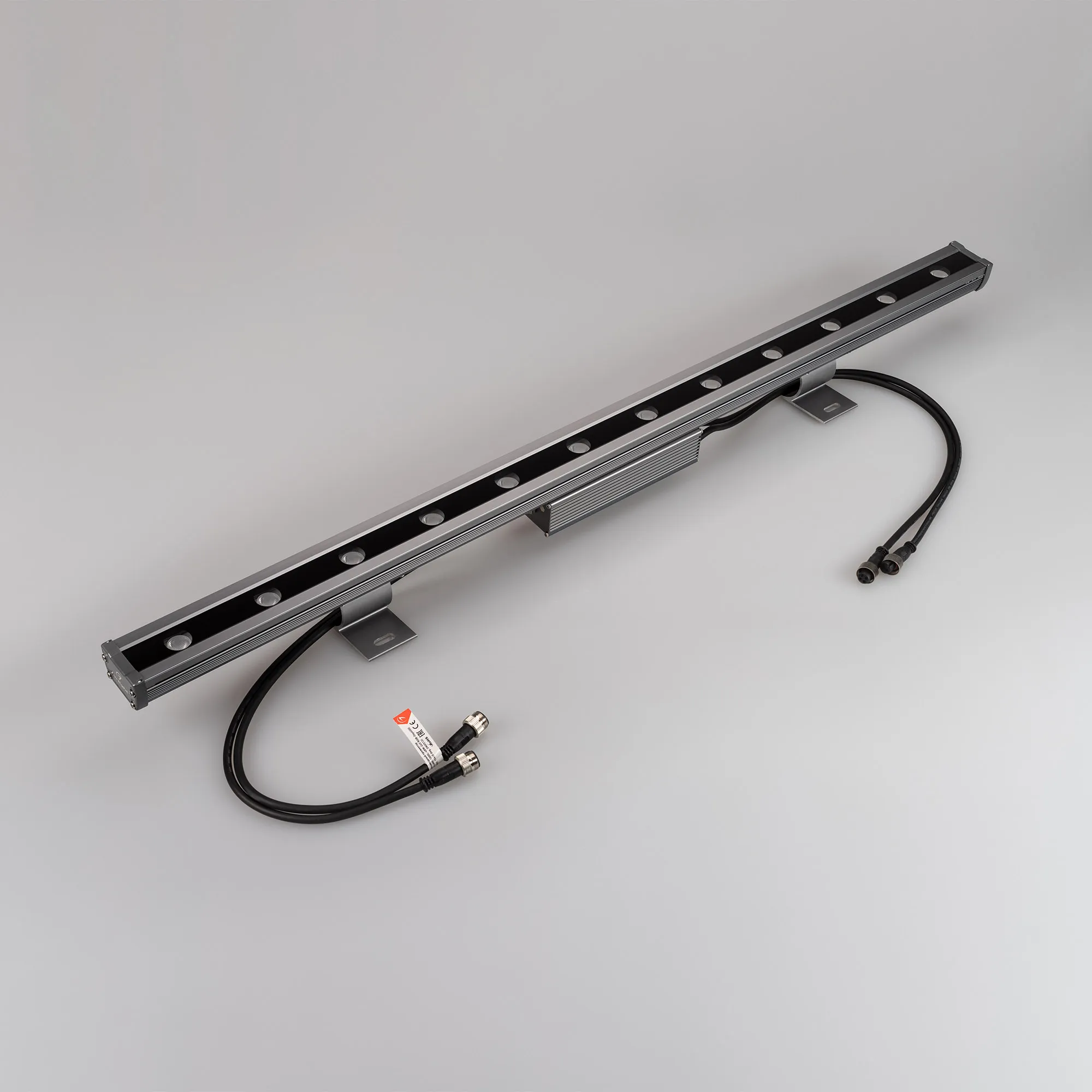 Линейный светодиодный прожектор "WALLWASHER. Мощность 48W, напряжение питания DC 24V. Количество светодиодов 12 штук. Цвет светодиодов RGB-Day(4000K) (4 кристалла в каждом светодиоде), управление по протоколу DMX512, угол рассеивания 15x45°. Корпус: алюминиевый сплав и армированное стекло. Цвет корпуса серый, степень влагозащиты IP65. Габариты 1000x54x35мм.