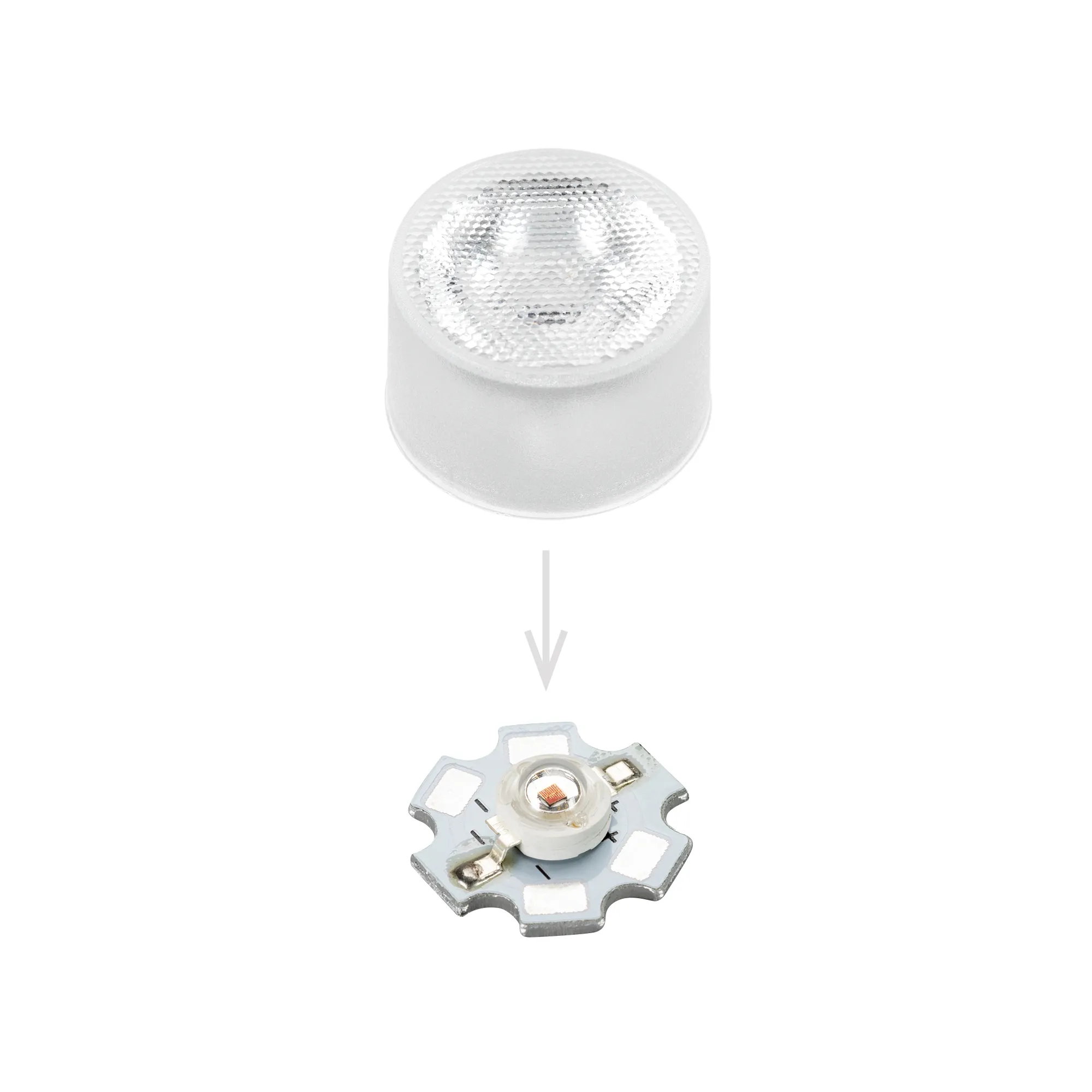 Одиночная линза цельная (с несъемным холдером) для мощного светодиода Emitter. Угол обзора: вертикальный 30°, прозрачная микропризма. Материал PC. Диаметр 21.8 мм, высота 13.45 мм.