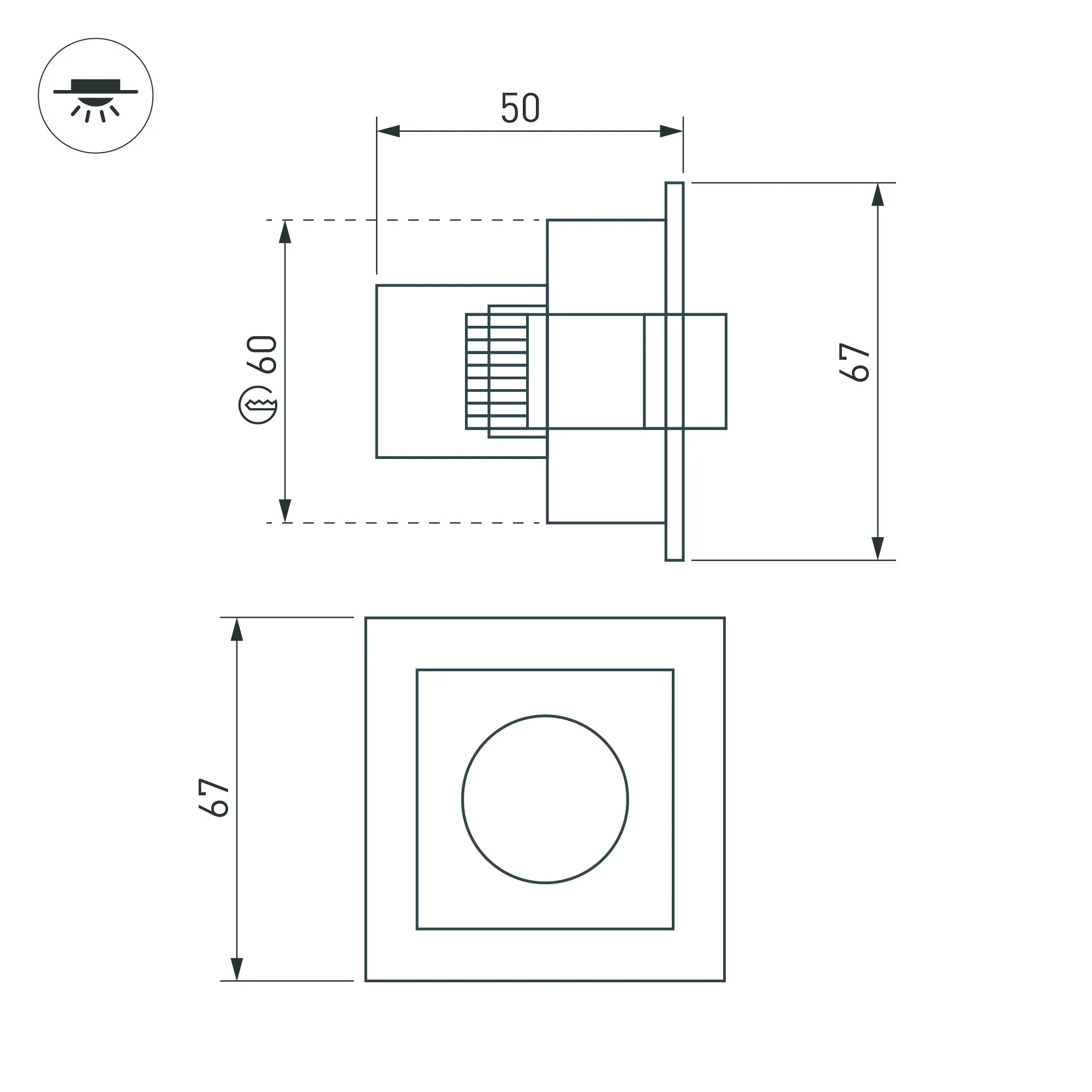 Встраиваемый поворотный светильник. Мощность 3 Вт, св. поток 188 лм, 59 лм/Вт, дневной 4000 K, CRI>98, угол 30°, напряжение питания 230 В. Чёрный прямоугольный корпус из алюминия, экран PMMA, степень защиты IP20. Размер: длина 67 мм, ширина 67 мм, высота 50 мм. Монтаж встраиваемый, установочное отверстие длина 60 мм, ширина 60 мм. Драйвер 2-4 В, 700 мА, пульсация <1%.
