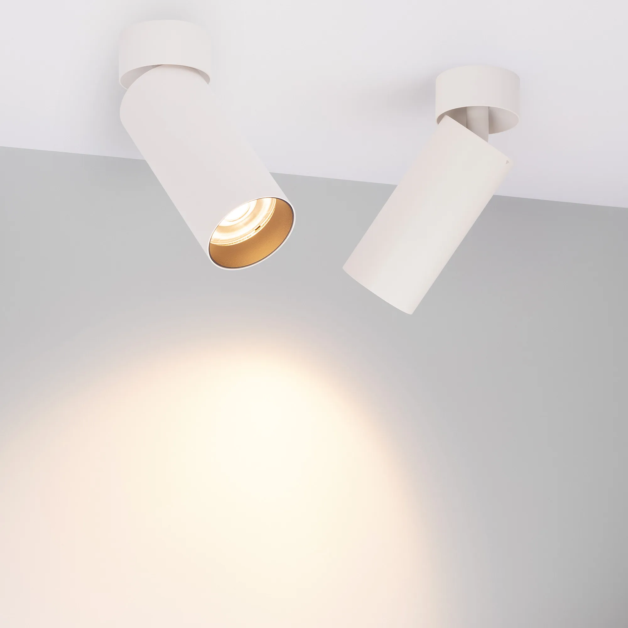 Накладной откидной светильник. Мощность 12 Вт, св. поток 1013 лм, 82 лм/Вт, теплый 3000 K, CRI>92, угол 36°, напряжение питания 230 В. Белый круглый корпус из алюминия, экран PMMA, степень защиты IP40. Размер: диаметр 60 мм, высота светового модуля 130 мм, высота основания 30 мм. Угол поворота 350°, угол наклона 90°. Монтаж накладной. Встроенный драйвер 27-42 В, 300 мA, пульсация <1%.