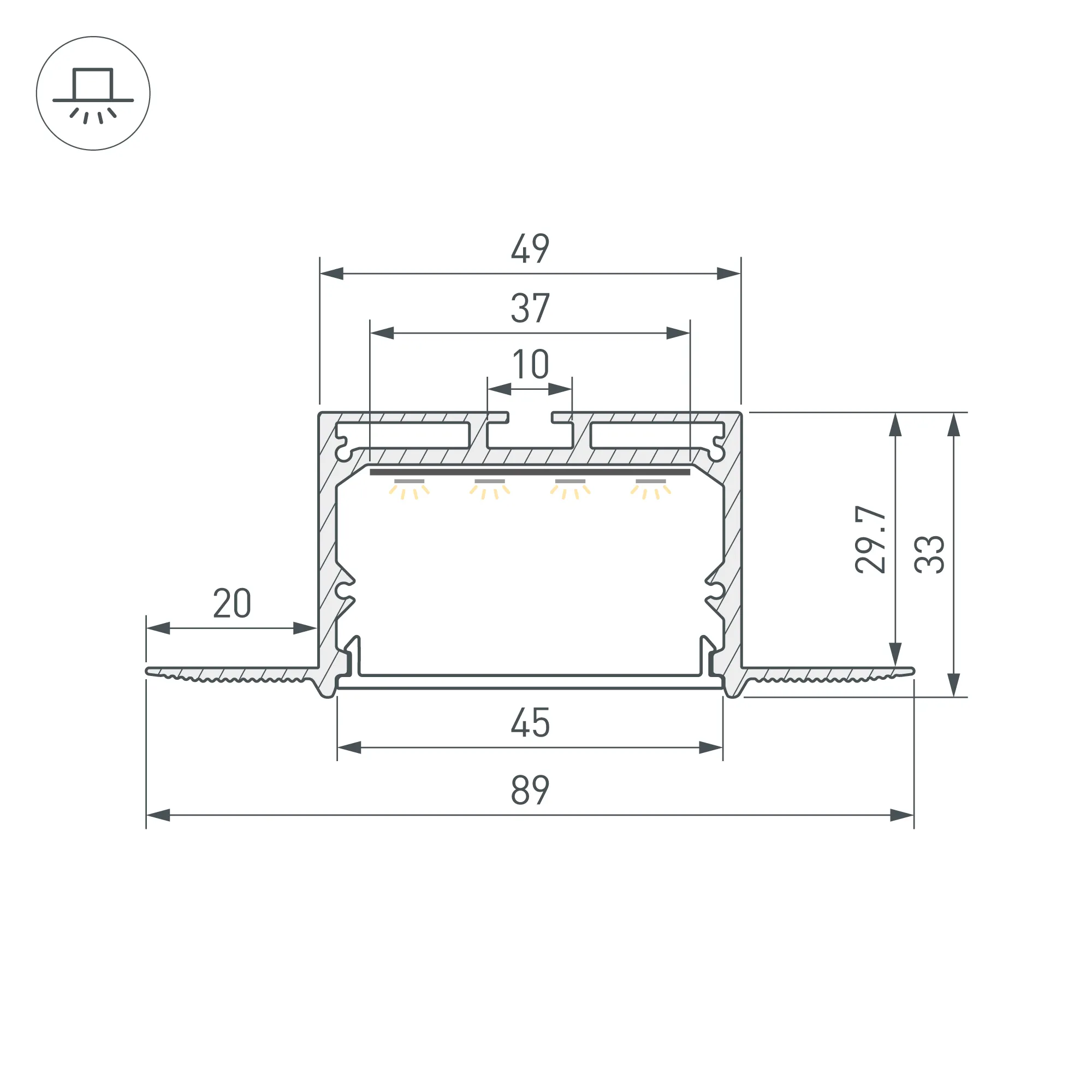 Алюминиевый анодированный профиль для светодиодных лент и линеек. Габаритные размеры (L×W×H): 3000x89x33 мм, паз для установки 49 мм. Ширина площадки для ленты 37 мм. Экраны, заглушки и другие аксессуары приобретаются отдельно. Цена за 1 метр.